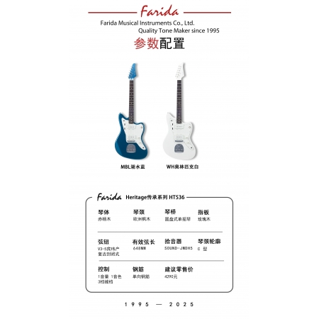 法丽达Farida传承系列HT536-Jazzmaster琴型,经典的“左岸”美学与多功能音色的完美结合。单向曲埋琴颈,圆盘式单摇琴桥,宾玮复古旋钮,零售价仅:4290元!