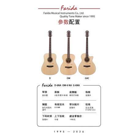 法丽达6系列为面单木吉他,提供D桶、OM桶与GAC桶三种经典桶型可选。作为法丽达的入门级系列,它以1980元的官方售价,诠释了“高性价比”的真正含义——让每位音乐爱好者都能轻松开启品质之旅
